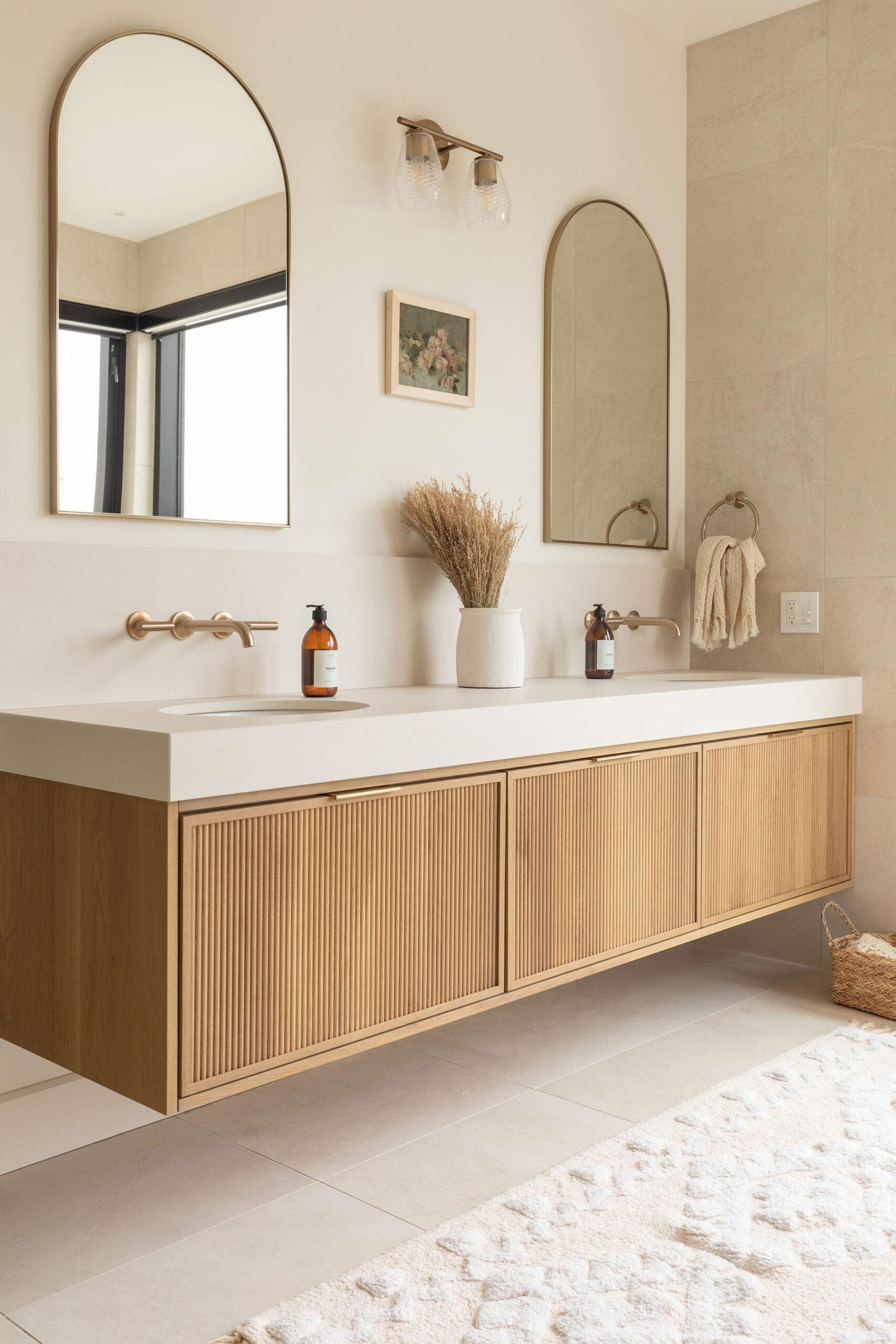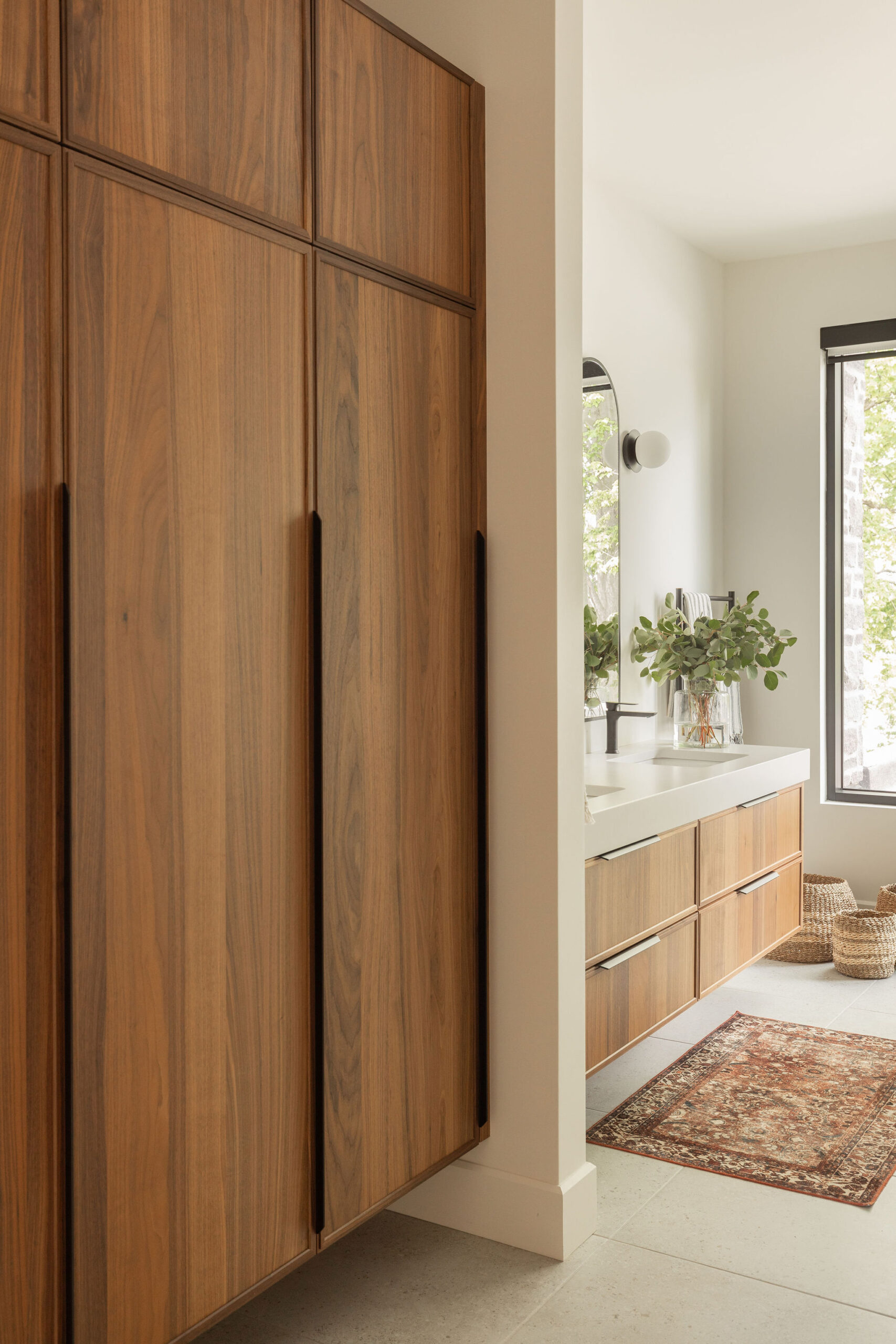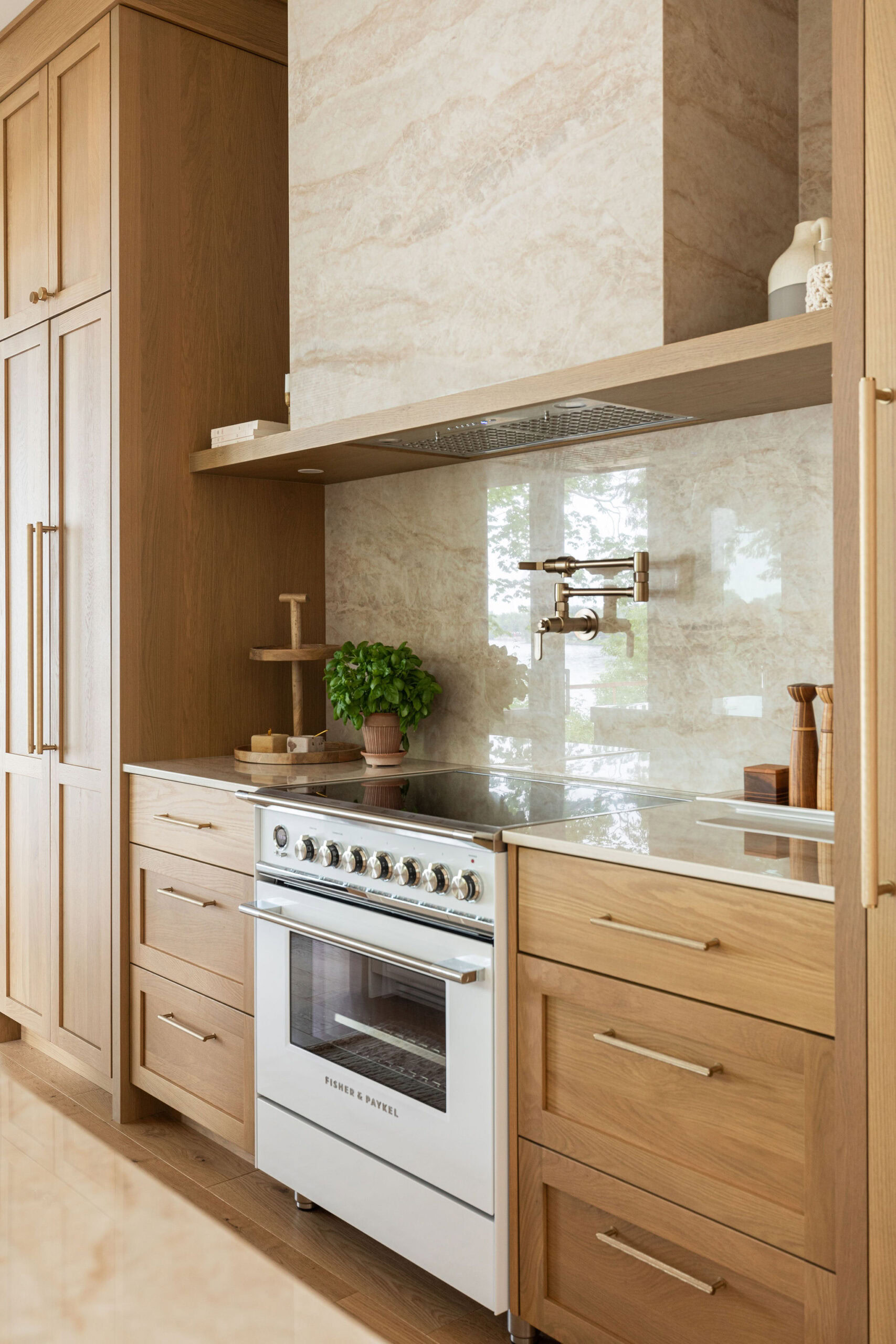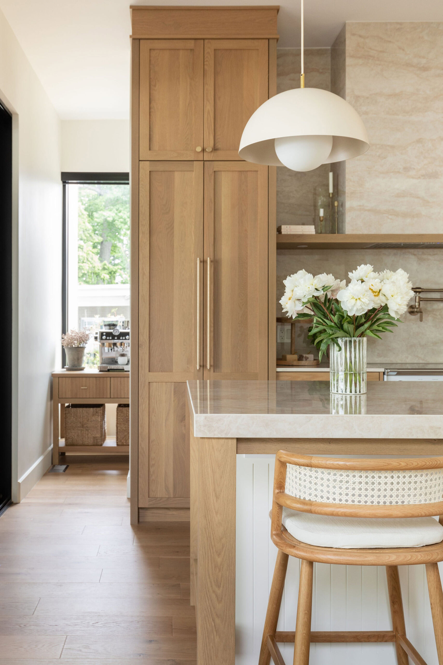 La cuisine séduit par son style minimaliste et apaisant, où le chêne blanc domine tout en douceur. Le tout est rehaussé par une richesse de textures soigneusement dosées, qui insufflent un sentiment de calme et d’harmonie.